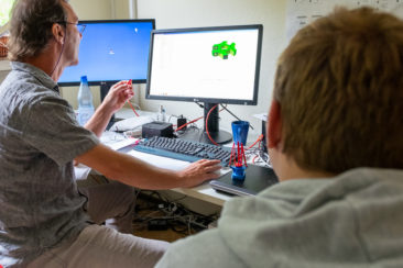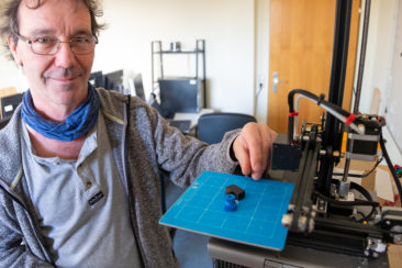 In der Computerwerkstatt des Internen Arbeitstrainings fertigt Michael Wickermann mit seinen Teilnehmern am 3D-Drucker Ersatzteile. In der fruchtbaren kleinen Kooperation mit dem Marburger Repair-Café konnte so beispielsweise eine Nähmaschine ihren Dienst wieder aufnehmen. Das Team reproduzierte das kleine blaue Zahnrad (siehe Foto) und brachte so letztendlich die Maschine wieder zum Laufen. Dazu musste die Form zunächst am Rechner ausgetüfftelt werden, erst dann wird der 3D-Drucker in Gang gesetzt.