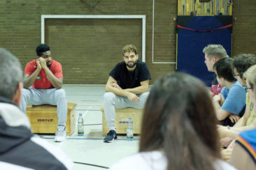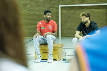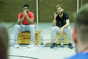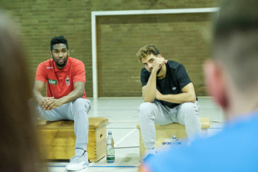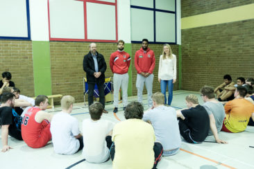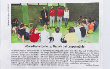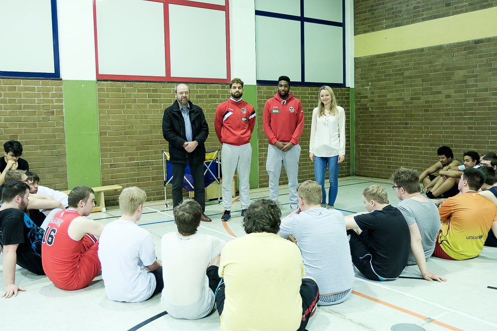 In Begleitung von Agnes Lachetta (Marketing) und Daniel Rohm (PR) besuchten Joshiko Saibou und Jahenns Manigat am 8.März 2017 die LepperMühle. Nach gemeinsamem Training mit unseren Basketballern und einem kleinen Testspiel, beantworteten die beiden Profispieler alle Fragen der Jugendlichen. So erfuhren wir, dass viele Spieler der 46ers an ihr Berufsleben nach der Spielerkarriere denken. Beispielsweise absolvieren einige ein Fernstudium im Bereich Sportmanagement neben ihrem aufwändigen Training und Spieleinsätzen. Jahenns, der 26-Jährige gebürtige Kanadier, verriet uns, dass er Psychologie studiere und später mit Jugendlichen arbeiten möchte. Welche anderen Sportarten sie zuvor gemacht hätten, welche sportlichen Ziele sie noch hätten und ob man eine Chance auf Erfolg habe, wenn man nicht so groß sei ... die beiden nahmen sich Zeit für die vielen Fragen, die unsere Jugendlichen hatten. Ein kleiner Imbiss rundete diesen gelungenen Nachmittag ab. Wir danken den 46ers fürs Kommen!
