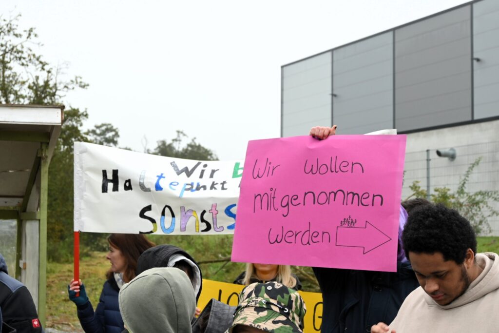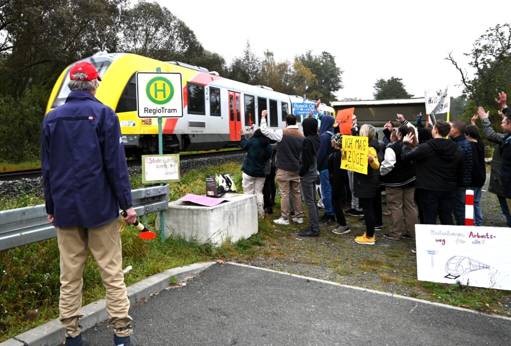 Buseck (pm). „Wir brauchen Haltepunkt Buseck-Ost – sonst sind wir lost“ oder „Wir wollen mitgenommen werden“ steht auf den Plakaten, die Jugendliche und Mitarbeiter von Leppermühle und Martin-Luther-Schule am Montagmorgen in die Höhe halten, als auf den Gleisen der Vogelsbergbahn der Zug vorbeirollt. Er wird auch diesmal nicht halten, denn die hier eingerichtete Haltestelle ist keine offizielle. Doch genau das fordern Leppermühle, Martin-Luther-Schule, die Verkehrswende-Initiative Buseck und im Busecker Industriegebiet ansässige Unternehmen. Ein Bahnhaltepunkt Buseck-Ost in der Kasseler Straße wäre vor allem für die Jugendlichen ein großer Gewinn, die täglich zur Martin-Luther-Schule pendeln oder von Wohngruppen in der Umgebung für co-therapeutische Angebote das Kerngelände der Leppermühle in Buseck erreichen müssen. Derzeit wird das von einem internen Fahrdienst geleistet – oder die Jugendlichen müssen lange Fußwege bis zu den Haltestellen in Großen-Buseck oder Reiskirchen in Kauf nehmen. Ein Bahnhaltepunkt Buseck-Ost würde ihnen die Mobilität vereinfachen und darüber hinaus bei der Verselbstständigung helfen, die eines der Ziele ihres Aufenthaltes im psychotherapeutischen Wohnheim ist. Auch den rund 1000 Mitarbeitern der Firmen im Industriegebiet käme der Haltepunkt zugute.
