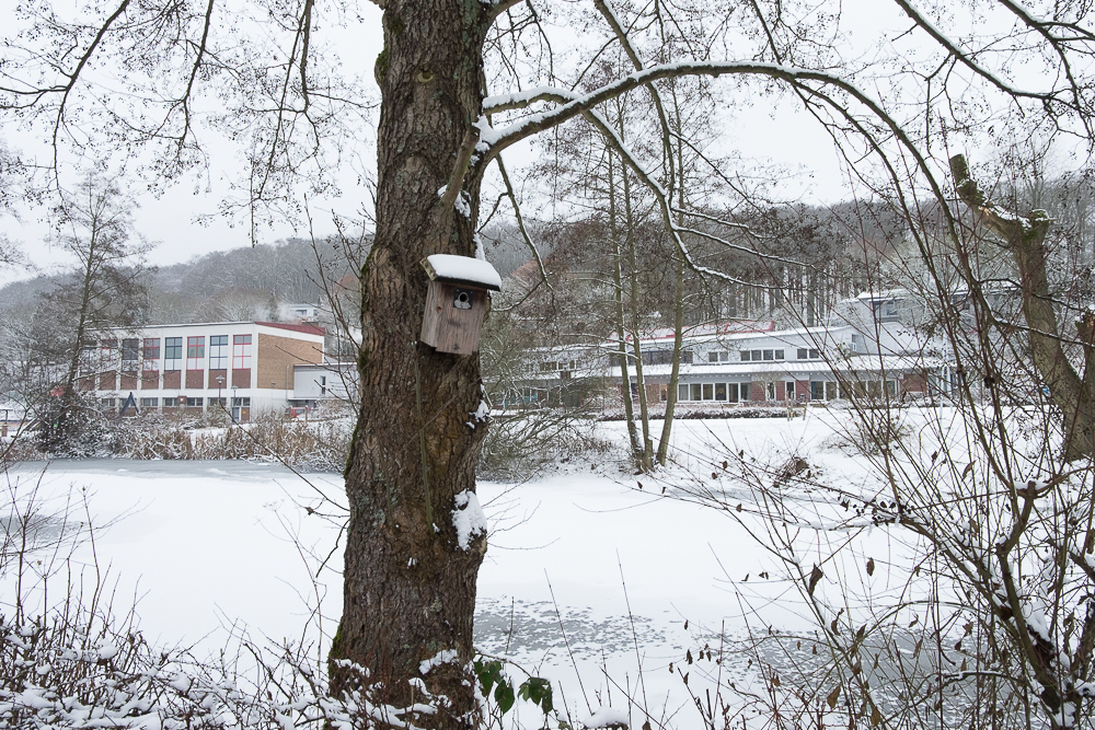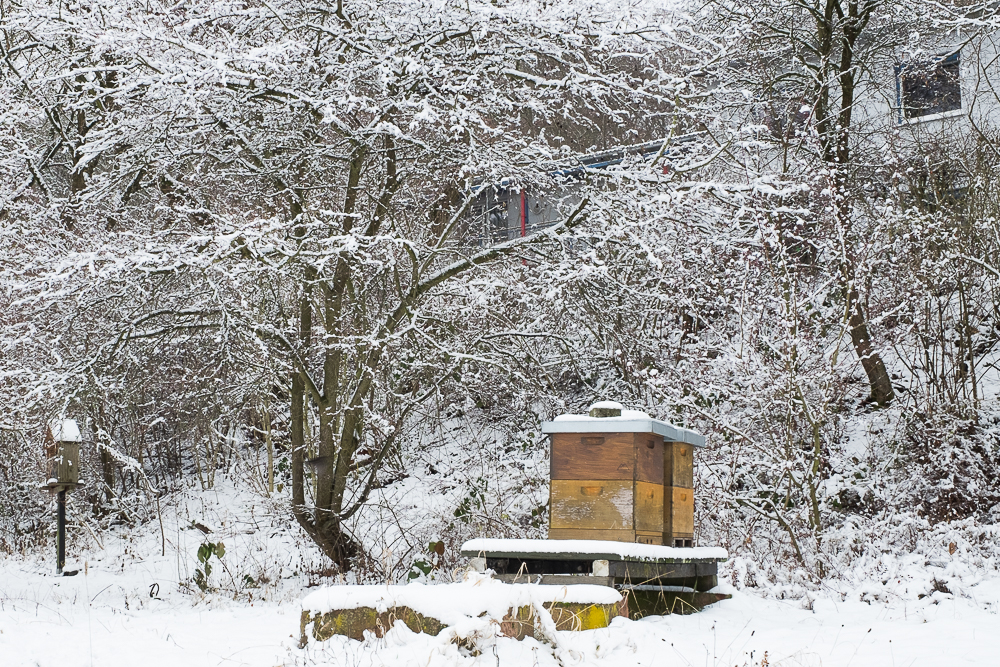 Der Winter hat unsere mittelhessische Landschaft in Besitz genommen. Das Gelände der LepperMühle bietet ganz ungewöhnliche Bilder. Von Eis gerahmt ist unser Hausbach, die Wieseck und um das Bienenhaus ist es jetzt ruhig.